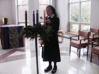 Sister Miriam, our Abbess, sprinkles holy Water on our Advent Wreath.