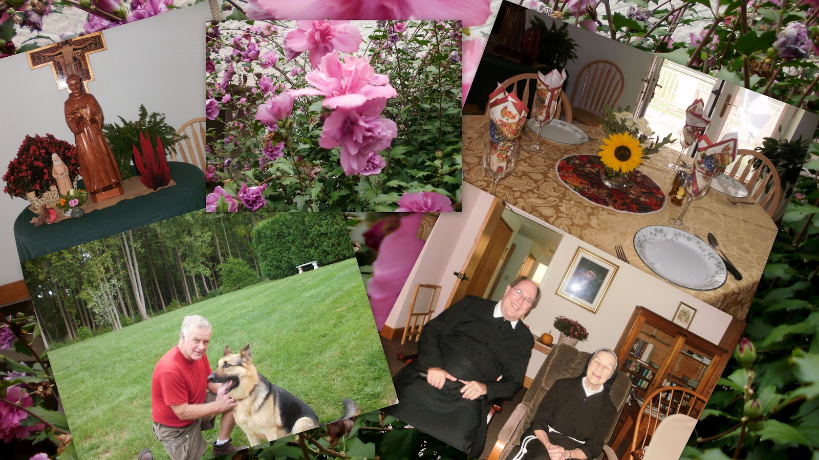 Below is a collage of our dining room with Saint Francis ,front and Center, our dining room table , Father Peter Cebulka , an Oratorian priest and friend of the community for years, our Abbess, sister Miriam and our good friend, Bernie McClain, with his German Shepherd dog, Marcus.